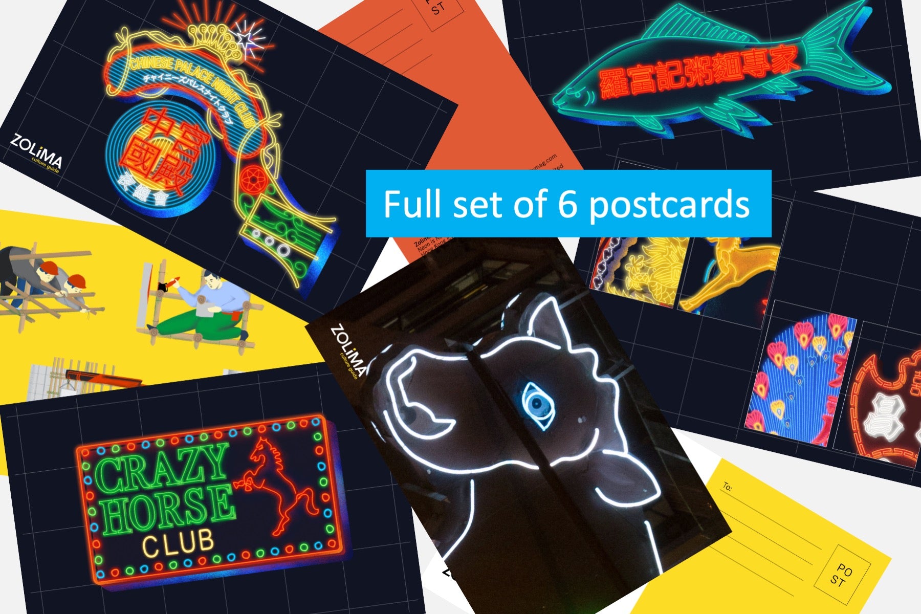 《霓虹不滅》系列共有四項產品:一套包含書籍及一張獨家 A2 海報的套裝(提供英文或中文版本)、一套六張明信片和三張 A5霓虹插畫卡,所有產品均展示了書中色彩繽紛的插畫。